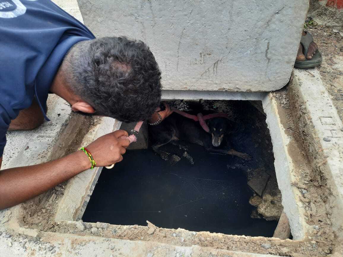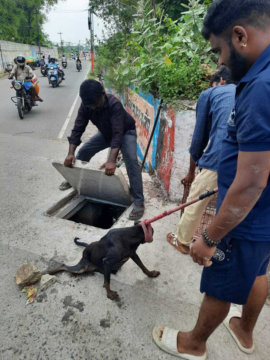 On August 23, 2025, we responded to an emergency call about a dog with a rod pierced through its throat. Our team member Dhilip removed the rod, and with assistance from Fire Services and Chitra Auto, rescued the dog from a gutter. The animal was transferred to Dr. Thanikachalam in Velachery for urgent treatment.